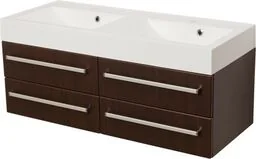 Szafka łazienkowa wenge mat 120cm FOKUS z umywalką podwójną FKS-W-U120/50/4 + UFKS-1200D Szafka pod umywalkę FOKUS w kolorze wenge matowym wraz z podwójną, dolomitową umywalką. Szafki posiadają dwie szuflady. Szafka wyposażona jest w system cichego domykania , który sprawia, że szuflady w ostatniej fazie zamykania zwalniają, aby niemal bezgłośnie się zamknąć. Prezentowana seria FOKUS to nowoczesny design w prostej formie. Ergonomiczny uchwyt aluminiowy łączy w meblach nowoczesny akcent i klasyczną elegancję.