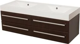 Szafka łazienkowa wenge mat 140cm FOKUS z umywalką podwójną FKS-W-U140/50/4 + NELA-1400D Szafka łazienkowa w kolorze egzotycznego drewna wenge matowym z białą, podwójną dolomitową umywalką z serii FOKUS. Zestaw posiada cztery szuflady. Umywalka posiada otwory na baterie. Szafka wyposażona jest w system cichego domykania , który sprawia, że szuflady w ostatniej fazie zamykania zwalniają, aby niemal bezgłośnie się zamknąć. Prezentowana seria FOKUS to nowoczesny design w prostej formie.