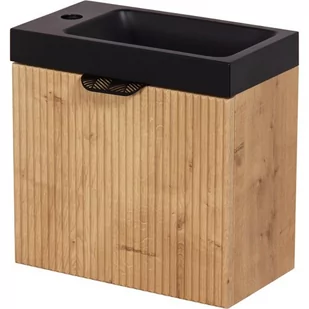 Wisząca szafka łazienkowa 40 cm Fresco Gante - fronty szafki umywalkowej są w kolorze dąb burlington mat. Front szafki zdobią niezwykle modne żłobione pionowe panele. Kolekcja szafek Fresco została stworzona głównie z myślą o małych łazienkach. Szafka z umywalką 40 cm do małej łazienki Gante.