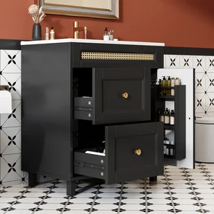 Wykończenie melaminowe: Powierzchnia szafki wykończona jest precyzyjnie melaminą, co zapewnia wysoką odporność na ścieranie i jednolity kolor. Estetyczne i odporne na wilgoć wykończenie pozwala zachować nowy wygląd nawet w wilgotnej łazience i gwarantuje długą żywotność. Dużo miejsca do przechowywania: Ta szafka łazienkowa wyposażona jest w dwudrzwiową szafkę z zawiasami z cichym domykiem i dwiema cichymi szufladami, które zaspokoją wszystkie Twoje potrzeby związane z przechowywaniem. Dodatkowo, posiada wiele przegródek wewnątrz drzwi i regulowane, wyjmowane półki, co pozwala na uporządkowane i efektywne przechowywanie akcesoriów łazienkowych, ręczników i innych przedmiotów. Każdy szczegół został starannie przemyślany, aby zoptymalizować przestrzeń do przechowywania. Prosty i nowoczesny design: Ta szafka łazienkowa łączy klasyczną czarną ramę z eleganckimi złotymi uchwytami, oferując nowoczesny, minimalistyczny i luksusowy wygląd. Tkane detale nad szufladami nadają jej wyjątkowy design i ciepły, naturalny akcent. Tworzy wyrafinowaną i modną atmosferę, która podkreśla charakter łazienki. Jednoczęściowa umywalka ceramiczna: Szafka podumywalkowa wyposażona jest w jednoczęściową umywalkę ceramiczną, idealnie wkomponowaną w design i wyposażoną w system zapobiegający przepełnieniu. Jej gładka powierzchnia jest wyjątkowo łatwa w czyszczeniu, co ogranicza konieczność konserwacji. Co więcej, jej przemyślana konstrukcja ułatwia montaż i zapewnia komfort użytkowania.