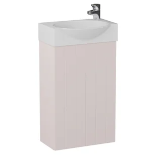 Szafka łazienkowa z umywalką krofam dia 40 cm pudrowy róż 142-0204 to funkcjonalny model utrzymany w niewielkich rozmiarach, które sprawdzą się w małej łazience i toalecie. Prezentowany mebel łazienkowy różowy wyróżnia się łagodnym, pudrowym odcieniem, który fantastycznie odnajdzie się w aranżacjach nowoczesnych, glamour oraz eklektycznych. Ryflowany front wykonany z płyty mdf zdobią pionowe linie. Wnętrze szafki z umywalką wypełniają dwie półki. Mebel łazienkowy występuje w formie zmontowanej.