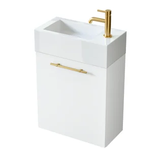 Nowoczesna szafka łazienkowa z umywalką uptrend nava 50 cm biały mat 004-su50-02+tr4127 to elegancki i praktyczny zestaw, którego kompaktowe wymiary doskonale sprawdzają się w małych przestrzeniach. Zestaw obejmuje białą umywalkę meblową, białą szafkę pod umywalkę oraz elegancki uchwyt w złotym kolorze. Podwieszana szafka wyposażona jest w drzwiczki z ryflowanym uchwytem oraz funkcją cichego domyku, gwarantując wygodę i trwałość. Jej gładki front został wykonany z płyty mdf, mebel w całości jes