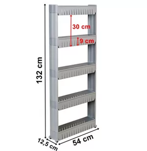 Regał został zaprojektowany tak, by wykorzystać wąskie przestrzenie np. między lodówką a szafką lub pralką a szafką. Regał posiada 5 głębokich półek, które pozwolą pomieścić wiele rzeczy np. akcesoria kuchenne, butelki, przyprawy.