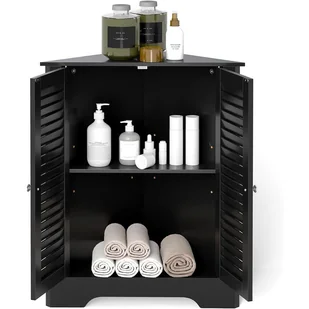 Dzięki konstrukcji w kształcie wachlarza ten wolnostojący mebel podłogowy można umieścić w dowolnym rogu mieszkania. A dzięki wodoodpornej powierzchni idealnie nadaje się również do kąta łazienki. Jako szafka do przechowywania, 2 poziomy wewnętrzne i płaski blat zapewniają przestronną przestrzeń do przechowywania. W szczególności środkowa półka jest wyjmowana i regulowana, dzięki czemu można na niej przechowywać różne przedmioty o różnych rozmiarach. Aby coś na niej umieścić, wystarczy otworzyć drzwiczki za pomocą dwóch zaokrąglonych uchwytów, a magnetyczne zamknięcie utrzymuje je w miejscu po zamknięciu szafki narożnej.