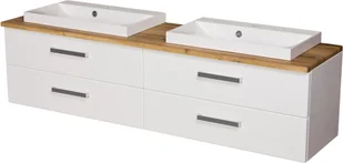Szafka łazienkowa FOKUS NEW 160 cm w białym połysku z blatem w kolorze dąb naturalny i dwiema umywalkami nablatowymi. Cztery szuflady z cichym domykiem, odporność na wilgoć i elegancki styl – idealna do przestronnych, nowoczesnych łazienek.