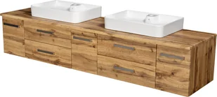 Szafka łazienkowa Fokus New 210 cm z blatem i 2 umywalkami nablatowymi. Dąb naturalny, 3 szuflady i 2 szafki z cichym domykaniem. Płyta MDF odporna na wilgoć. Przestronny, elegancki mebel do dużych łazienek. Gotowy do montażu, 2 lata gwarancji.