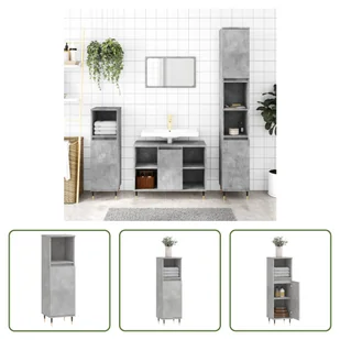 Szafka łazienkowa betonowa szara 30x30x100 cm materiał drewnopochodnyTa szafka łazienkowa będzie świetnym dodatkiem do Twojej łazienki i nada jej schludny i przyciągający wzrok wygląd!Trwały materiał: Drewno inżynieryjne to wyjątkowej jakości materiał o gładkiej powierzchni, który charakteryzuje się wytrzymałością, stabilnością i odpornością na wilgoć. Mnóstwo miejsca do przechowywania: Meble łazienkowe mają 2 przedziały z drzwiczkami i 1 otwarty przedział, który oferuje różne opcje przechowywania i dodatkowe miejsce na przedmioty w łazience. Elastyczny montaż drzwi: