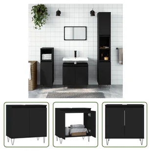 Szafka łazienkowa czarna 58x33x60 cm materiał drewnopochodnyTa szafka łazienkowa będzie świetnym dodatkiem do Twojej łazienki i nada jej schludny i przyciągający wzrok wygląd!Trwały materiał: Drewno inżynieryjne to wyjątkowej jakości materiał o gładkiej powierzchni, który charakteryzuje się wytrzymałością, stabilnością i odpornością na wilgoć. Mnóstwo miejsca do przechowywania: Meble łazienkowe mają 1 dużą komorę z 2 drzwiami, co zapewnia mnóstwo miejsca do przechowywania przedmiotów w łazience. Żelazne nóżki: