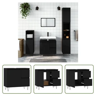 Możesz zamontować drzwi i szuflady po lewej lub prawej stronie, w zależności od potrzeb. Żelazne nóżki: Żelazne nóżki nadają wnętrzu industrialny styl, zapewniając jednocześnie stabilność szafki łazienkowej. Uwaga: Aby zapobiec przewróceniu się, produkt należy przymocować za pomocą dołączonego uchwytu ściennego. Kolor: CzarnyMateriał: