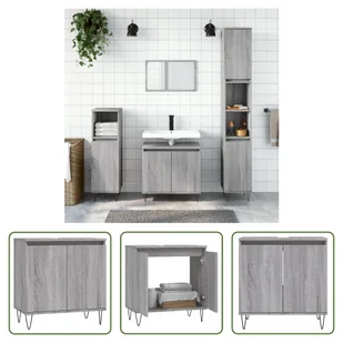 Żelazne nóżki nadają wnętrzu industrialny styl, zapewniając jednocześnie stabilność szafki łazienkowej. Uwaga: Aby uniknąć przewrócenia, produkt ten należy zabezpieczyć za pomocą dołączonego uchwytu ściennego. ZaletyTa szafka łazienkowa jest doskonałym dodatkiem do łazienki i nadaje jej schludny i przyciągający wzrok wygląd! Zawartość opakowaniaSzafka łazienkowa szara Sonoma 58x33x60 cm z materiału drewnopochodnego (1x) Dobrze wiedziećTwoje zamówienie zostanie dostarczone w jednej paczce. Gdy tylko zamówienie zostanie pomyślnie zapakowane, natychmiast otrzymasz od nas informacje o dostawie. Mamy nadzieję, że będziesz zadowolony z zakupu.