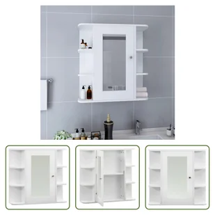 biały i srebrnyMateriał: MDF z powierzchnią z melaminy, szkłoWymiary całkowite: 66 x 17 x 63 cm (szer. x gł. x wys.)Wymiary półki za drzwiczkami (każda): 34,8 x 13,2 cm (szer. x gł.)Wymiary półki bocznej (każda): 13,9 x 15,4 cm (szer. x gł.)Wymiary lustra: