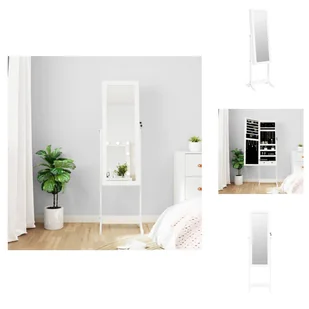 Przechowuj swoją biżuterię i perfumy dyskretnie i elegancko w tej stylowej lustrzanej szafce na biżuterię z oświetleniem LED! Trwały materiał: Drewno inżynieryjne to materiał o wyjątkowej jakości i gładkiej powierzchni, który charakteryzuje się wytrzymałością, stabilnością i odpornością na wilgoć. Wykonana z litego drewna szafka na biżuterię jest łatwa do czyszczenia wilgotną ściereczką. Dużo miejsca do przechowywania: Szafka z lustrem ma 2 szuflady i liczne haczyki, wieszaki i półki, dzięki czemu biżuteria jest uporządkowana i łatwo dostępna.