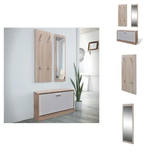 dąb i białyMateriał: materiał drewnopochodny + tworzywo sztuczne + stop aluminiumWymiary całkowite: 80 x 27 x 46,5 cm (dł. x szer. x wys.)Wysokość schowka: 36 cmSzafy: Rozmiar: 45 x 100 cm (dł. x wys.)Z 4 metalowymi haczykamiLustro: