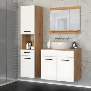 Zestaw Łazienkowy Szafka Wisząca 90cm Słupek Umywalka Z Lustrem Dąb Wotan