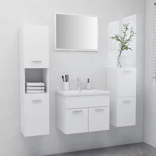 TakDostawa obejmuje: 1 x lustro1 x szafka podumywalkowa1 x szafka midi1 x wysoka szafka Stwórz dodatkową przestrzeń do przechowywania w swojej łazience dzięki temu stylowemu zestawowi mebli łazienkowych. Czyste linie i prosty design będą idealnie pasować do Twojej łazienki. Zestaw mebli składa się z szafki podumywalkowej, szafki midi, wysokiej szafki i lustra. Elegancka szafka podumywalkowa ma 1 komorę i zapewnia idealne miejsce na umywalkę.