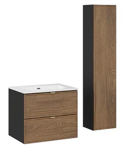 To idealne rozwiązanie do wnętrz, w których liczy się zarówno porządek, jak i nowoczesna estetyka. Fronty z naturalnym rysunkiem drewna i czarne korpusy tworzą wyrafinowany kontrast, a złote uchwyty dodają subtelnej elegancji. Czy nie warto wyposażyć łazienki w zestaw, który pomieści wszystko i nadal wygląda znakomicie? Praktyczne rozwiązania, które porządkują codzienność: Kompaktowa szafka z dwiema szufladami – idealna na kosmetyki, akcesoria i drobiazgi. Wiszący słupek z drzwiami na zawiasach – świetny do przechowywania większych zapasów lub ręczników.