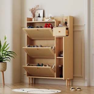 dekoracyjny styl wiejskiego domu z drzwiami szafki ze sztucznego rattanumiejsce do przechowywania do 20 par butów, dodatkowa szuflada i szafka na długie przedmiotygórna powierzchnia platformy na przedmiotyReplika acyjne i podręcznenowa konstrukcja drzwi na zawiasach wykonana z oddychającego polirattanusolidna konstrukcja z płyty MDF o gładkiej powierzchniOpisSzafka na buty łączy w sobieReplika acyjny design z praktycznym zastosowaniem. Z drzwiami szafki wykonanymi ze sztucznego rattanu, prezentuje się w uroczym stylu udanego połączenia wiejskiego domu i nowoczesnego stylu, aby nadać Twojemu domowi świeży akcent.