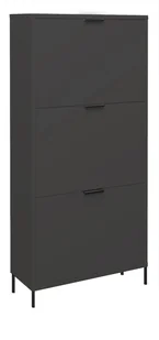 Ta przestronna szafka na buty z trzema klapami oferuje miejsce na 12 do 18 par butów do rozmiaru 50, co czyni ją idealnym rozwiązaniem do przechowywania dla całej rodziny. Klapy, szuflady i drzwi są wyposażone w system cichego i delikatnego zamykania. Solidne krawędzie są zaokrąglone, aby zapewnić bezpieczeństwo i atrakcyjny wygląd. Metalowe tylne uchwyty śrubowe podkreślają prosty, ale elegancki design i gwarantują łatwą obsługę. Szafka spoczywa na solidnych metalowych nóżkach, które nie tylko tworzą pływający wygląd, ale także ułatwiają czyszczenie podłogi.