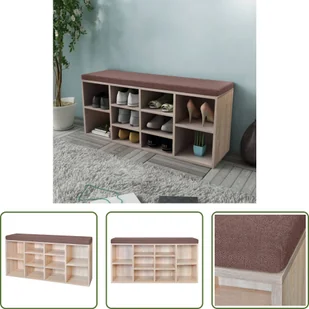 Montaż jest bardzo łatwy. Kolor: dąb (rama) + brąz (siedzisko)Materiał ramy: Materiał drewnopochodny pokryty melaminąWymiary całkowite: 103 x 30 x 48 cm (dł. x szer. x wys.)10 przegródekMateriał: Bawełna: 30%, len: 70%