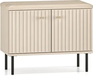 Dwudrzwiowa szafka na buty ELLEN 2D nowoczesna do przedpokojuSzafka na buty ELLEN 2Djest bardzo funkcjonalna, prócz przestrzeni na buty, w swojej konstrukcji zawiera miękkie siedzisko tapicerowane wysokiej jakości welurem w modnym kolorze kaszmirowym. Szafka jest wykonana z trwałej płyty laminowanej, dzięki temu zachowa swój piękny wygląd, a kontakt z wilgocią, która szczególnie pojawia się w przedpokoju, nie wpłynie na prezentację szafki. Fronty są wykonane z płyty MDF gwarantując odporność na uszkodzenia mechaniczne i długotrwałość użytkowania mebla, który będzie zachwycał swoim wyglądem przez długi czas, a uchwyty w kolorze szczotkowanego złota nadają im elegancji i luksusu. Dodatkowym atutem szafki do przedpokoju są zawiasy z funkcją cichego domyku, który niweluje gwałtowne zatrzaśnięcie drzwi i umożliwia delikatne zamknięcie drzwi bez zakłócania spokoju pozostałych domowników, co jest szczególnie istotne w nocy. Kaszmirowy kolor korpusu oraz frontów szafki idealnie komponuje się z kolorem siedziska, a dodatkowe zdobienia frontów poprzez frezowanie nadają jej wyjątkowego charakteru i nowoczesności.