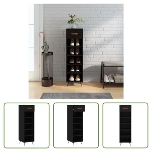 Szafka na buty czarna 30x35x105 cm materiał drewnopochodnyUtrzymaj porządek w domu dzięki tej eleganckiej szafce na buty!Trwały materiał: Materiał drewnopochodny to materiał wyjątkowej jakości o gładkiej powierzchni, który charakteryzuje się wytrzymałością, stabilnością i odpornością na wilgoć. Mnóstwo miejsca do przechowywania: Dzięki 1 szufladzie i 5 otwartym przegrodom, ta szafka na buty oferuje mnóstwo miejsca do przechowywania wszystkich rodzajów obuwia. Solidna górna półka: