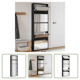 Szafka na buty z lustrem 5 przegródek czarna 63x17x169,5 cmTa szafka na buty z 5 uchylnymi przegrodami ma nowoczesny i stylowy wygląd i jest doskonałym meblem do schludnego przechowywania butów. Nadaje się do przedpokoju, salonu, sypialni i każdego innego miejsca, w którym chciałbyś ją mieć. Trwały materiał: Materiał drewnopochodny jest wyjątkowej jakości o gładkiej powierzchni, a także charakteryzuje się wytrzymałością, stabilnością i odpornością na wilgoć. Dużo miejsca do przechowywania: