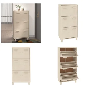 Szafka na buty HAMAR miodowy brąz 59,5x35x117 cm lite drewno sosnoweTa drewniana szafka jest zarówno dekoracyjnym, jak i praktycznym dodatkiem do Twojego wnętrza. Wykonana z litego drewna sosnowego szafka na buty jest stabilna i wytrzymała. Posiada trzy klapy, które oferują dużo miejsca do bezpyłowego przechowywania butów. Dzięki tej praktycznej szafce na buty już nigdy nie będziesz się irytować butami leżącymi w pobliżu. Twoje zaletyDodaj odrobinę niepowtarzalnego uroku do swojego wnętrza dzięki tej drewnianej szafce na buty! Pozostałe specyfikacjeKolor: