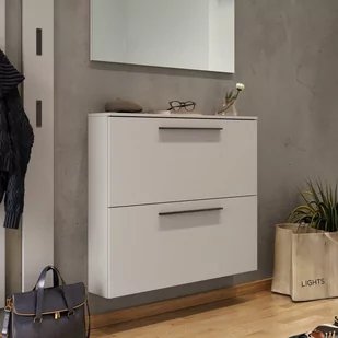 Szafka na buty GW-Utah marki Germania nadaje każdemu wejściu nowoczesny wygląd. Ta seria przekonuje wyjątkowo smukłymi szafkami na buty, które mają tylko 19 cm głębokości. Dzięki niewielkiej głębokości te szafki do przechowywania obuwia idealnie wpasowują się w wąskie korytarze. Szafka na buty w eleganckim kolorze kaszmiru wyposażona jest w dwie klapki, za którymi można przechowywać łącznie osiem par butów w dwóch metalowych koszach. Meble mają 100 cm szerokości, 85 cm wysokości i tylko 19 cm głębokości.