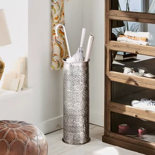 Kunsztownie wykonany dodatek posiada misternie wykonany wzór od sztancy. Z trwałego i wytrzymałego aluminium. Stylowo przechowuje parasole, laski, a nawet nada się do kwiatów. Ten piękny model wykonany z wytrzymałego aluminium pokazuje jak w świetnym stylu przechowywać parasole lub laski. Na szczególną uwagę zasługuje misterny wzór, który zdobi powierzchnię i nadaje jej orientalny charakter.
