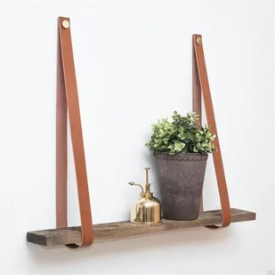 Wieszak na półkę wykonany ze skóry w kolorze brązowym z błyszczącą mosiężną gałką. 2x pasek skórzany: Długość: 600mm Szerokość: 30mm 2 gałki: wysokość: 14mm średnica:
