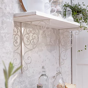 Ozdobne wsporniki z żelaza w stylu francuskim. Nadaje każdej półce „to coś”. Łatwo je zamocować, a czynią cuda! Nadaj swoim półkom odrobinę francuskiego stylu! Dzięki tym pięknie zdobionym wspornikom każda półka będzie przyciągać wzrok.