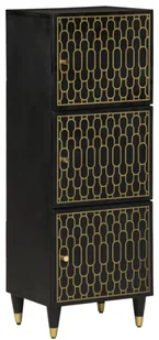 Idealna do wnętrz o duszy, gdzie każdy szczegół ma znaczenie. Pozwól sobie na odrobinę klasyki w nowoczesnym wydaniu. Funkcjonalny styl retro - szafka trzydrzwiowa Wyjątkowy design z rzeźbionymi frontami - elegancka, drewniana konstrukcja mebla z ręcznie zdobionymi czarnymi frontami w złote wzory nadaje mu wyjątkowego, artystycznego charakteru. Praktyczna funkcjonalność z 3 półkami - 3 pojemne półki oferują dużo miejsca do przechowywania oraz eksponowania dekoracji i przedmiotów. Łatwe otwieranie dzięki uchwytom - okrągłe, złote uchwyty zapewniają wygodny dostęp do wnętrza szafki.