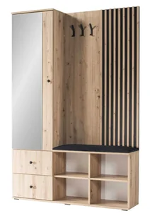 Mebel powstał z najwyższej jakości 16 mm laminowanej płyty meblowej o klasie higieny E1. Brzegi szafy zostały precyzyjnie oklejone specjalistycznym tworzywem ABS o zwiększonej odporności na ścieranie i wilgoć. Szafa posiada wygodne półki na buty, dwie szuflady na akcesoria, czapki, rękawiczki. Nad szafkami znajduje się obszerna szafa na płaszcze z praktycznym lustrzanym frontem. Obok znajdują się trzy metalowe wieszaki, które są tak skonstruowane, by zmieścić aż sześć ubrań, każdy na osobnym wieszaku! Wygodne, tapicerowane siedzisko podkreśla wdzięki ścianki z lamelami i pozwala na wygodę podczas wkładania butów.