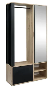 Brzegi garderoby zostały precyzyjnie oklejone specjalistycznym tworzywem PCV o zwiększonej odporności na ścieranie i wilgoć. Ergonomiczne stylowe uchwyty oraz reling na wieszaki powstały z trwałego metalu nierdzewnego pomalowanego proszkowo na kolor czarny. Kompaktowe wymiary, doskonale zaplanowana przestrzeń do przechowywania oraz modernistyczny design garderoby to prosty przepis na stylowy i uporządkowany przedpokój. Praktyczne rozwiązania: • Konstrukcja z laminowanej płyty meblowej w 2 kolorach do wyboru.