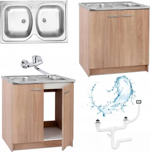 Szafka Kuchenna Dąb Sonoma 80 cm Zlew 2 Komory Bateria Chrom Ścienna Syfon