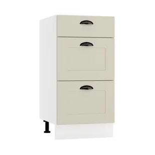 Szafka kuchenna stojąca 40 ADELE D40S/3 to funkcjonalna szafka modułowa o szerokości 40 cm z szufladami, która posiada korpus w kolorze białym mat wykonany z płyty laminowanej oraz front w matowym beżowym odcieniu z płyty MDF foliowanej. Grubość płyt wynosi 16 i 19 mm. Szafka wyposażona jest w 3 praktyczne szuflady, które posłużą do przechowywania produktów spożywczych, sztućców oraz innych elementów wyposażenia kuchni. W szufladach zastosowano prowadnice typu metabox z system cichego domykania, dzięki czemu zapobiegniemy głośnemu trzaskaniu drzwiczek podczas użytkowania. Regulowane stopki umożliwią dopasowanie wysokości szafki stojącej do wzrostu użytkownika oraz umożliwi zachowanie poziomu wszystkich szafek w razie nierówności podłogi. Szafka kuchenna 40 ADELE D40S/3 pozwoli na stworzenie kuchni na miarę własnych oczekiwań.