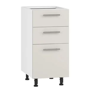 Korpus szafki wykonany jest z trwałej, 16-milimetrowej płyty laminowanej w kolorze białym, co gwarantuje solidność i łatwość w utrzymaniu czystości. Jej fronty, z foliowanej płyty MDF o matowym wykończeniu w eleganckim kolorze kaszmiru, wnoszą do wnętrza subtelne ciepło i ponadczasowy styl. Całość dopełniają metalowe uchwyty o szerokości 128 mm, podkreślające nowoczesny charakter mebla. Regulowane czarne stopki z tworzywa umożliwiają precyzyjne wypoziomowanie szafki nawet na nierównej podłodze, gwarantując jej stabilność. Szafka sprzedawana jest bez blatu i maskownicy, dzięki czemu z łatwością dopasujesz ją do swojej indywidualnej aranżacji kuchni.