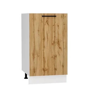 Szafka kuchenna stojąca 45 BONO D45 P/L to modułowa szafka kuchenna stojąca modułowa, która posiada korpus w kolorze biały mat wykonany z płyty laminowanej oraz front w kolorze dąb złoty z płyty laminowanej. W szafce zastosowano zawiasy z mechanizmem cichego domykania, dzięki czemu zapobiegniemy głośnemu trzaskaniu drzwiczek podczas użytkowania. Szafka posiada uniwersalny montaż frontu, dzięki czemu drzwiczki szafki mogą się otwierać na lewą lub prawą stronę. Regulowane stopki umożliwią dopasowanie wysokości szafki stojącej do wzrostu użytkownika oraz umożliwi zachowanie poziomu wszystkich szafek w razie nierówności podłogi. Szafka kuchenna 45 BONO D45 P/L to praktyczny element z kolekcji mebli kuchennych firmy Stolkar o szerokości 45 cm umożliwiający zagospodarowanie dolnej przestrzeni o tej samej szerokości.