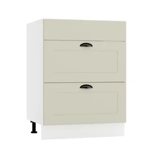 Szafka kuchenna stojąca 60 ADELE D60 PC S/2 to szafka z kolekcji mebli ADELE z systemu TREND LINE przeznaczona pod płytę grzewczą. Szafka pod płytę grzewczą oznacza, że posiada ona przestrzeń wentylacyjną, oddzieloną od komory dłużącej do przechowywania, co ułatwia wentylację samej płyty i zapobiega nagrzewaniu rzeczy znajdujących się w szafce. Szafka wykonana jest z wytrzymałych i solidnych elementów. Front stanowi płyta MDF foliowana w matowym beżowym odcieniu, a korpus z płyty laminowanej w kolorze biały mat. Wszystkie szafki kuchenne z kolekcji nie zawierają blatu, co jest zaletą systemu, gdyż blat można dobrać indywidualnie z szerokiej oferty blatów dostępnych na rynku. Szafka kuchenna stojąca 60 ADELE D60PC S/2 wyposażona jest w dwie praktyczne szuflady na akcesoria kuchenne, które przydadzą się podczas gotowania. Dodatkowo regulowane nóżki umożliwią wyprofilowanie mebla i stawienie go na właściwej wysokości.