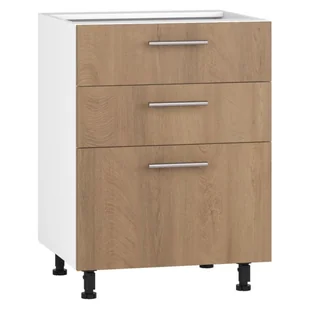 Szafka kuchenna stojąca 60 VENTO D3S-60/82 wykonana jest z płyty meblowej laminowanej w kolorze białym oraz jej fronty z płyty MDF w kolorze dąb miodowy o matowym wykończeniu. Szafka wyposażona jest w 3 szuflady, które są funkcjonalnym elementem mebli kuchennych. W szufladach możemy przechowywać wszystko, od drobiazgów kuchennych po garnki, talerze, kubki. Mechanizm Hettich oraz mechanizm cichego domykania szuflad Linken System to inwestycja w komfortowy mebel. Szuflady w szafce zamykają się płynnie i niemal bezgłośnie. Cichy domyk nie tylko zwiększa komfort użytkowania, ale zapewnia dłuższą żywotność produktu. Poręczne metalowe uchwyty ułatwiają otwieranie i zamykanie szuflad. Szafka wsparta jest na regulowanych stopkach w kolorze czarnym, które ułatwią zachowanie poziomu w razie krzywizn podłóg. Prezentowany model szafki to doskonały wybór dla wszystkich tych, którzy cenią sobie funkcjonalne, ponadczasowe i solidne meble. Połącz szafkę Vento D3S-60/82 z pozostałymi meblami z kolekcji VENTO i stwórz nowoczesną kuchnię na miarę własnych potrzeb.