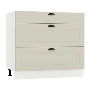 Szafka kuchenna stojąca 90 ADELE D90S/3 PC to funkcjonalna szafka modułowa o szerokości 90 cm z szufladami, która posiada korpus w kolorze białym mat wykonany z płyty laminowanej oraz front w matowym beżowym odcieniu z płyty MDF foliowanej. Grubość płyt wynosi 16 i 19 mm. Szafka wyposażona jest w 3 praktyczne szuflady, które posłużą do przechowywania produktów spożywczych, sztućców oraz innych elementów wyposażenia kuchni. W szufladach zastosowano prowadnice typu metabox z system cichego domykania, dzięki czemu zapobiegniemy głośnemu trzaskaniu drzwiczek podczas użytkowania. Regulowane stopki umożliwią dopasowanie wysokości szafki stojącej do wzrostu użytkownika oraz umożliwi zachowanie poziomu wszystkich szafek w razie nierówności podłogi. Szafka kuchenna 90 ADELE D90S/3 PC pozwoli na stworzenie kuchni na miarę własnych oczekiwań.
