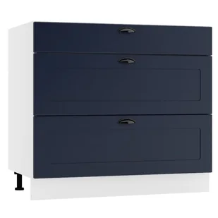 Szafka kuchenna stojąca 90 ADELE D90S/3 PC to funkcjonalna szafka modułowa o szerokości 90 cm z szufladami, która posiada korpus w kolorze białym mat wykonany z płyty laminowanej oraz front w kolorze granatowy mat z płyty MDF foliowanej. Grubość płyt wynosi 16 i 19 mm. Szafka wyposażona jest w 3 praktyczne szuflady, które posłużą do przechowywania produktów spożywczych, sztućców oraz innych elementów wyposażenia kuchni. W szufladach zastosowano prowadnice typu metabox z system cichego domykania, dzięki czemu zapobiegniemy głośnemu trzaskaniu drzwiczek podczas użytkowania. Regulowane stopki umożliwią dopasowanie wysokości szafki stojącej do wzrostu użytkownika oraz umożliwi zachowanie poziomu wszystkich szafek w razie nierówności podłogi. Szafka kuchenna 90 ADELE D90S/3 PC pozwoli na stworzenie kuchni na miarę własnych oczekiwań.