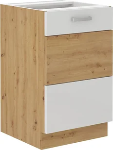Dolna szafka kuchenna z systemu sektorowego ADARA pasuje do każdej kuchni i doskonale wykorzystuje każdą część przestrzeni. Korpus mebla wykonany jest z dębu rzemieślniczego, a wnętrze z matowej bieli. Drzwi są zamontowane na zawiasach z cichym domykaniem. Uchwyt i cokół są wliczone w cenę. Wymiary: szerokość: 50 cmwysokość: