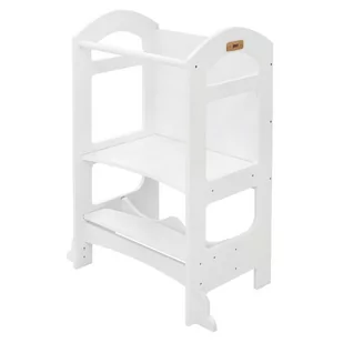 1 x Wieża edukacyjna z tablicą Dane techniczne: Materiał: drewno Kolor: biały Waga: ok. 10,3 kg Wymiary (dł. x szer. x wys.): 70 cm x 40 cm x 90 cm Wysokość stojaka: