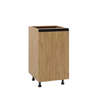 Bari plus szafka dolna prawa d-45 dąb kamienny to prawostronna szafka dolna od kuchni, której minimalistyczny uchwyt aluminiowy w formie czarnej listwy oraz system cichego domknięcia drzwi zapewnia najwyższy komfort użytkowania. Imitowane na meblach kuchennych naturalnego drewno doskonale odzwierciedla prawdziwą strukturę dębu oraz układ włókien, a przy tym zapewnia prostszą pielęgnację oraz większą odporność na uszkodzenia mechaniczne. Kolekcja kuchni komfort skierowana do aranżacji nowoczesny