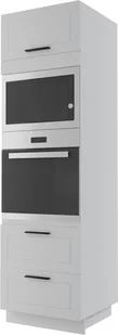 Bergamo słupek pod zabudowę piekarnika/mikrofalówki d14/ru/2m 284 metabox biały mat został wyposażony w drzwiczki i dwie szuflady z cichym domykiem. Fronty szafki są wykonane z foliowanej płyty mdf. Charakteryzuje się ona gładką i nieporowatą powierzchnią. Jest jednolita, twarda i trwała. Folia zabezpiecza ją przed działaniem wilgoci.