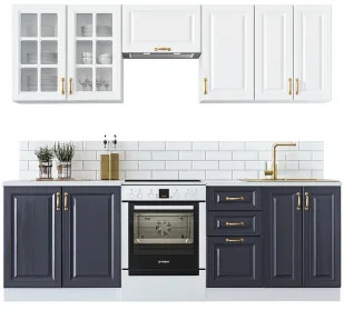 Elegancja, która spotyka się z niezwykłą funkcjonalnością: Frezowane fronty nadające meblom klasyczny, ponadczasowy i głęboki charakter. Biały blat, który nie tylko jest niezwykle praktyczny i łatwy w utrzymaniu czystości, ale także doskonale rozjaśnia przestrzeń. Złote uchwyty, które są jak biżuteria dla Twojej kuchni, dodając całej aranżacji nuty luksusu i wyrafinowania. Zabudowa o długości 240 cm, która zapewnia mnóstwo miejsca do przechowywania wszystkich niezbędnych akcesoriów, utrzymując idealny porządek.