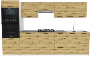 Kompletny zestaw 5 szafek stojących i 4 wiszących, który pozwala zaaranżować w pełni funkcjonalną kuchnię bez konieczności dokupywania dodatkowych elementów. W zestawie znajduje się blat dopasowany do szafek dolnych oprócz zlewozmywakowej, gwarantujący spójny i estetyczny wygląd całego wnętrza. Szafka zlewowa jest gotowa na montaż, dzięki przewidzianemu otworowi pod zlew nakładany, co znacznie przyspiesza i ułatwia instalację. Przejrzysty i ergonomiczny podział przestrzeni w szafkach pozwala na utrzymanie idealnego porządku i zapewnia miejsce na wszystkie niezbędne akcesoria kuchenne. Materiały, na których możesz polegać na co dzień: