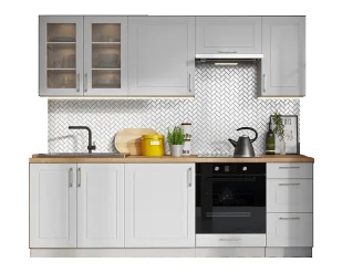 Płyta wyróżnia się ponadprzeciętną trwałością i odpornością na wilgoć i parę. Korpusy w kolorze jasnopopielatym zostały zestawione z frontami w dekorze Szary mat. Do stworzenia frontów wykorzystaliśmy 16 mm foliowaną płytę MDF o klasie higieny E1 i wysokiej odporności na wilgoć i kuchenne osady. Kolorystyczne detale w postaci uchwytów z trwałego metalu podkreślają ponadczasowy design mebli. Dolne szafki zostały wyposażone w m etalowe szuflady typu metalbox, miejsce do montażu zlewu oraz pojemne półki do przechowywania, naczyń, sprzętu kuchennego i produktów spożywczych .