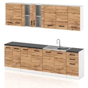 Zestaw Mebli Kuchennych Z Blatem 2.6m Jowita Dąb Wotan to kompleksowe rozwiązanie, które pozwoli Ci w prost sposób urządzić kuchnię w nowoczesnym stylu. Zestaw składa się z funkcjonalnych i estetycznych szafek w kolorze białego matu i frontu dąb wotan, który doskonale wpasuje się w różne style wnętrz, od skandynawskiego po nowoczesny. Dodatkowo, zestaw jest wyposażony w 180 cm blat, który można dostosować do indywidualnych potrzeb, co czyni go niezwykle praktycznym rozwiązaniem do każdej kuchni. Najważniejsze cechy produktu: